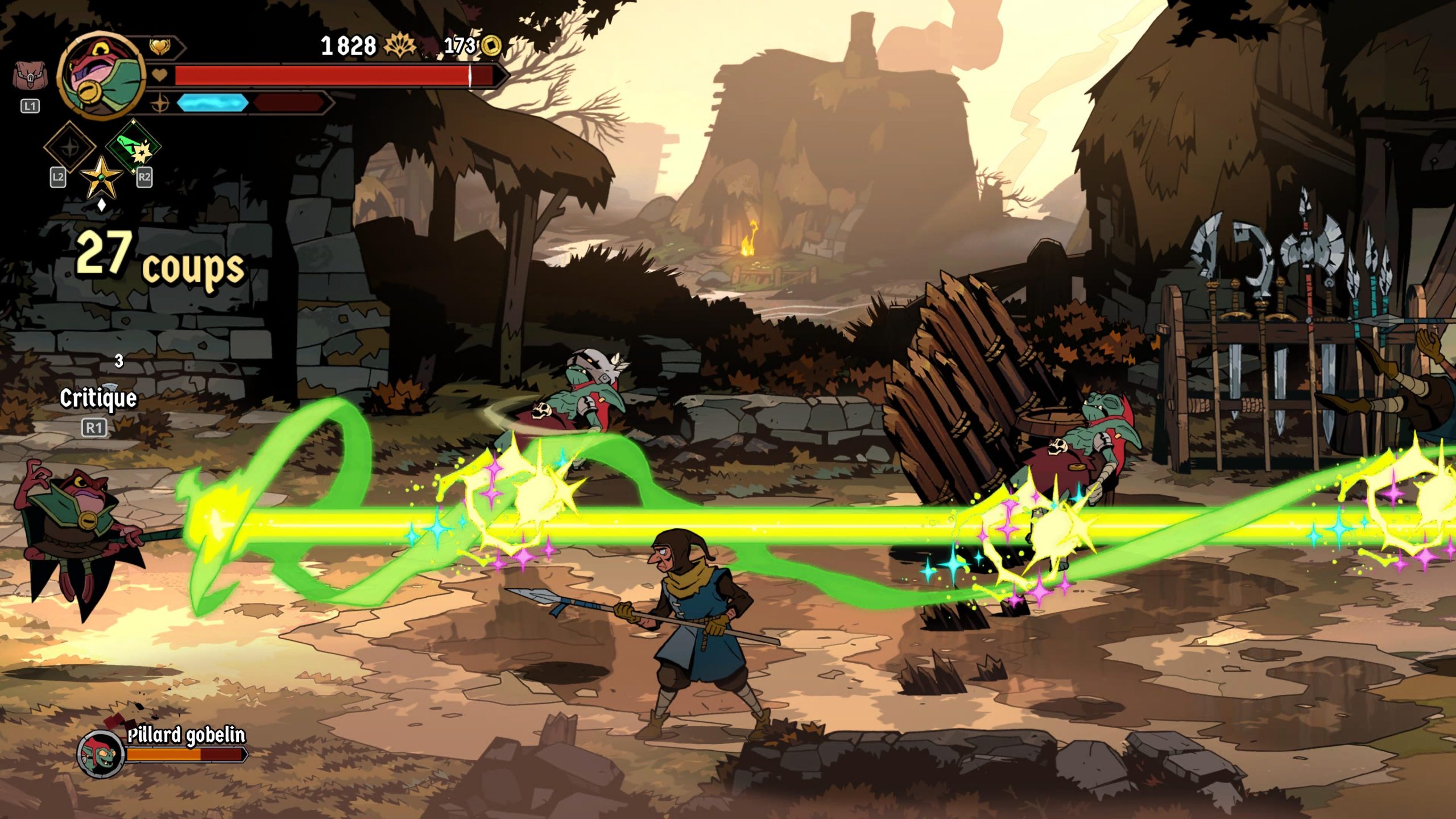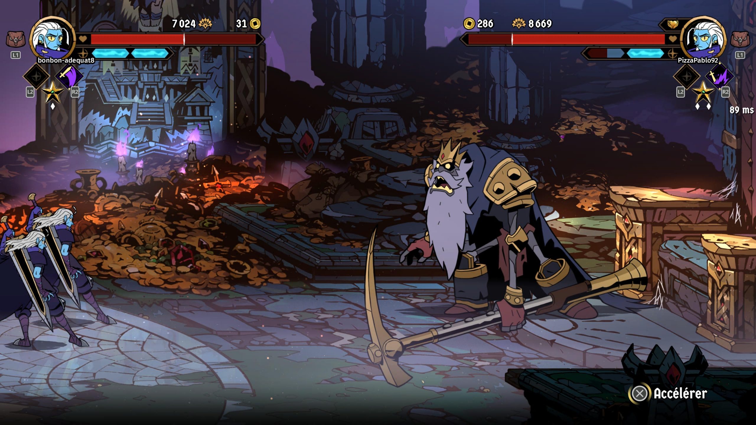 Le mode multijoueur d’Absolum permet de parcourir l’intégralité de l’aventure en coopération à deux joueurs, aussi bien en local qu’en ligne. Fidèle à l’esprit du beat’em up classique, cette approche renforce la dimension conviviale du jeu tout en préservant la lisibilité de l’action, grâce à une caméra parfaitement adaptée aux deux combattants. Chaque joueur conserve sa propre progression, ses améliorations et son style de combat, ce qui permet des combinaisons intéressantes entre les différents héros. Les affrontements gagnent ainsi en intensité, les compétences se complétant pour créer un véritable ballet d’attaques coordonnées.
